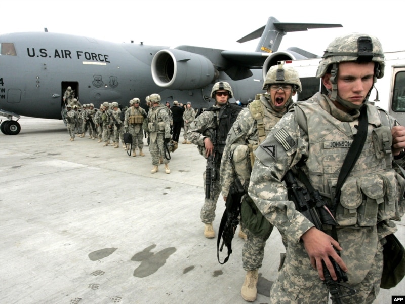 Американские солдаты выходят из самолета, прибывшего из Афганистана. Авиабаза "Манас", 26 февраля 2009 года.