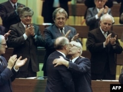 Советский лидер Михаил Горбачев обнимает генсека Компартии ГДР Эриха Хонекера. Москва, 17 апреля 1986 года.