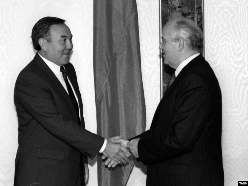 Президент СССР Михаил Горбачев и президент Казахской ССР Нурсултан Назарбаев обмениваются рукопожатиями. Москва, 1990 год.
