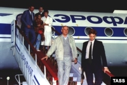 Президент СССР Михаил Горбачев с семьей приехал из Фороса, где находился под домашним арестом во время путча ГКЧП. Московский аэропорт, 22 августа 1991 года.