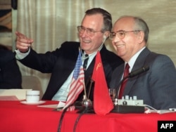 Президент США Джордж Буш-старший и советский лидер Михаил Горбачев на пресс-конференции после саммита США - СССР на Мальте. 3 декабря 1989 года.