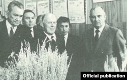 Первый секретарь ЦК Компартии Казахстана Динмухамед Кунаев, председатель Совета министров Казахской ССР Нурсултан Назарбаев (слева крайние), генеральный секретарь ЦК КПСС Михаил Горбачев (крайний справа). Целиноград, 1985 год.