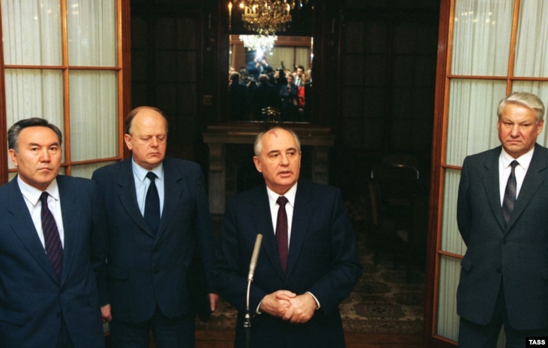 Слева направо: Нурсултан Назарбаев, Станислав Шушкевич, Михаил Горбачев, Борис Ельцин. Москва, 14 ноября 1991 года. В этот день Госсовет СССР рассмотрел проект договора о Союзе суверенных государств.