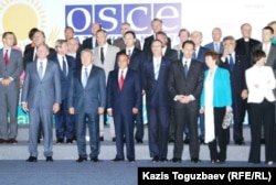 Участники встречи министров стран - членов ОБСЕ позируют для общего фото. В первом ряду второй слева - президент Казахстана Нурсултан Назарбаев. Курорт "Ак-Булак", Алматинская область, 17 июля 2010 года.