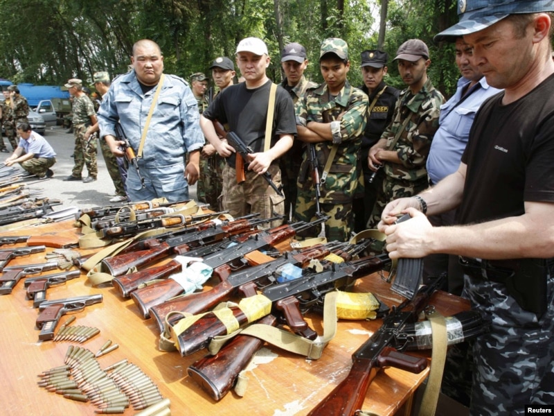 Милиция проверяет оружие, предположительно использованное в ходе этнических столкновений и собранное в ходе рейдов. Ош, 24 июня 2010 года.