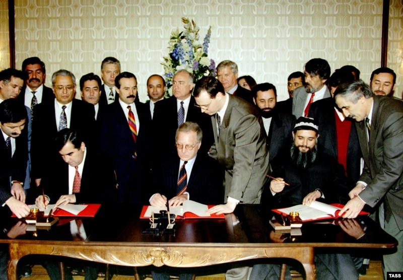 Президент Таджикистана Эмомали Рахмон (слева) и лидер оппозиции Саид Абдулло Нури (справа) подписывают соглашение, которое предусматривало включение оппозиции в правительство. В центре спецпредставитель ООН Дитрех Меррем. Москва, 23 декабря 1996 года.