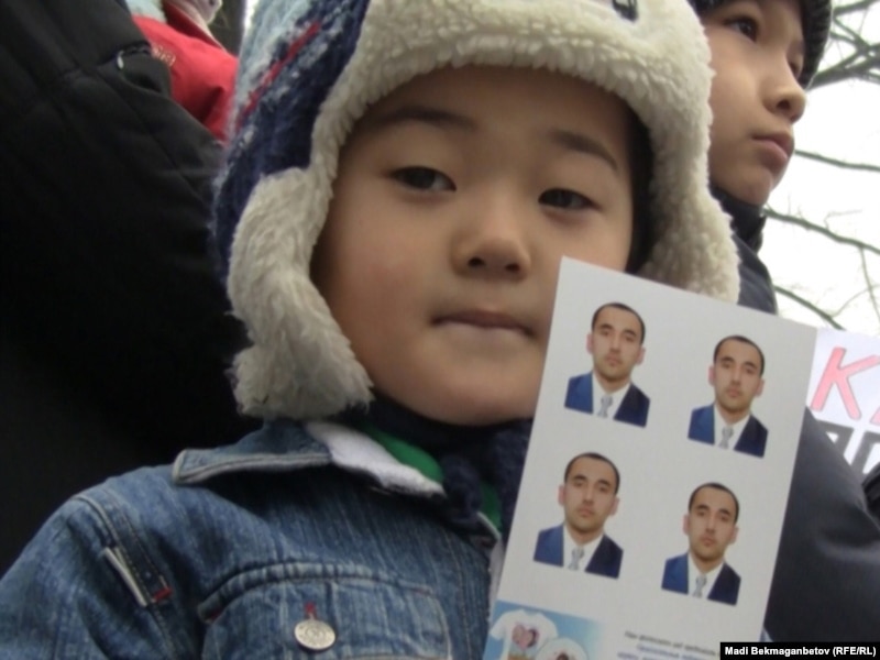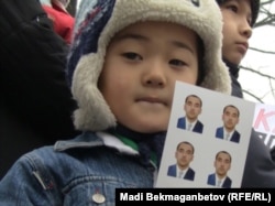 Тимур Худойберды-Ахунов держит в руках фотографию отца Аброра Касымова, гражданина Узбекистана, находящегося в СИЗО Алматы. Узбекский мальчик участвует в пикете жен арестованных узбекских беженцев против их экстрадиции в Узбекистан. Алматы, 2 декабря 2010 года.
