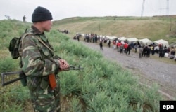 Кыргызский пограничник наблюдает за лагерем узбекских беженцев из Андижана. Село Бараш, 19 мая 2005 года.