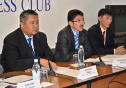 Представители ранее неизвестных общественных организаций Канат Жуман (слева), Максат Нурыпбаев (в центре). Астана, 20 сентября 2011 года.