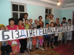 Несколько семей оралманов, пришедших поддержать семью Сакена Айбергена, держат в руках плакат с надписью: «Зачем нас позвали!» Актобе, 14 августа 2011 года.