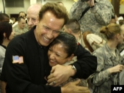 Арнольд Шварценеггер в бытность губернатором Калифорнии обнимает американского солдата в Лагере Победы на окраине Багдада. 16 ноября 2009 года.