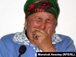 Рахиля Иманкулова, мать осужденного по делу Шанырака Ерганата Тараншиева, плачет на пресс-конференции. Алматы, 29 ноября 2010 года.