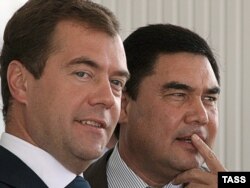 Президенты Туркменистана Гурбангулы Бердымухамедов (справа) и России - Дмитрий Медведев. Туркменбаши, 13 сентября 2009 года.