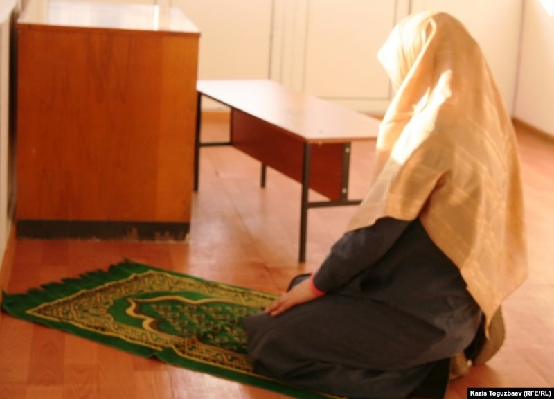 Маргуба Худойберди-Ахунова, жена узбекского беженца, совершает намаз в здании суда. Алматы, 27 декабря 2010 года.