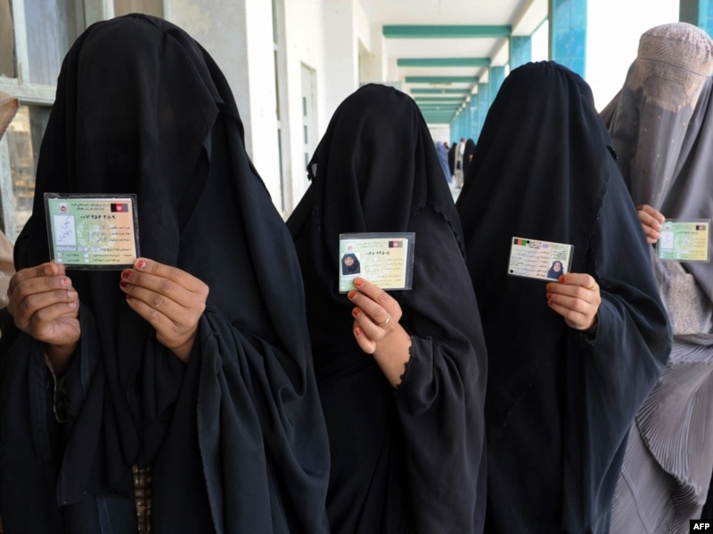 Женщины в парандже показывают свои документы, чтобы проголосовать на избирательном участке. Кандагар, Афганистан, 20 августа 2009 года.
