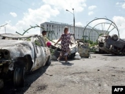 Жители Андижана проходят мимо машин, сгоревших в результате столкновения демонстрантов с силами безопасности. 14 мая 2005 года.