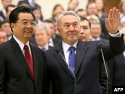 Председатель Китая Ху Цзиньтао и президент Казахстана Нурсултан Назарбаев на церемонии запуска трубопровода Казахстан - Китай. Астана, 12 декабря 2009 года.