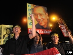 Участники протеста после объявления китайского диссидента Лю Сяобо лауреатом Нобелевской премии мира требуют его освобождения. Гонконг, 8 октября 2010 года.