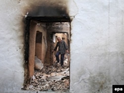 Житель Оша посреди развалин своего дома, разрушенного в ходе этнического конфликта. 17 июня 2010 года.