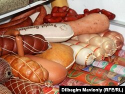 Халалные колбасные изделия, представленные на выставке сельскохозяйственной продукции. Алматы, 2 ноября 2010 года.