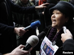 Узбекский политэмигрант, правозащитник Мутабар Таджибаева принимает участие в акции протеста против визита президента Узбекистана Ислам Каримова в столицу Европейского союза. Брюссель, 24 января 2011 года.