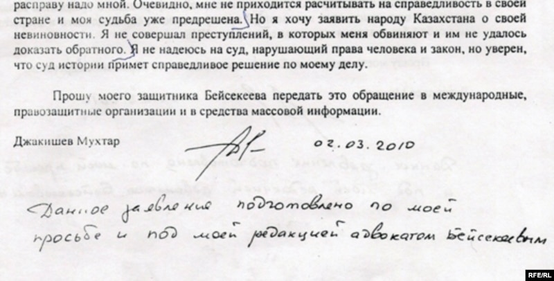 Финальная часть текста заявления осужденного топ-менеджера Мухтара Джакишева о нарушениях его прав на защиту. Астана, 2 марта 2010 года.