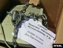 Участники движения «За свободный Интернет» и международный фонд по защите свободы слова «Адил соз» отправили спикеру мажилиса парламента Уралу Мухамеджанову посылку – монитор и клавиатуру, закованные цепями в знак протеста против принятия мажилисменами в первом чтении законопроекта, регулирующего деятельность интернет-ресурсов. Алматы, 29 апреля 2009 года.