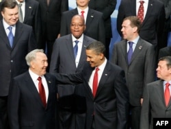 Президенты США и Казахстана Барак Обама и Нурсултан Назарбаев (в первом ряду) во время группового фото участников саммита по ядерным вопросам. Вашингтон, 13 апреля 2010 года.