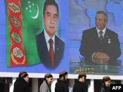 Девушки-туркменки идут под гигантским портретом президента Гурбангулы Бердымухамедова. Ашгабад, 11 ноября 2009 года.