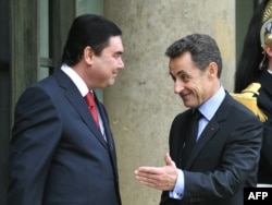 Президенты Франции Николя Саркози (справа) и Туркменистана Гурбангулы Бердымухамедов (слева). Париж, 1 февраля 2010 года.